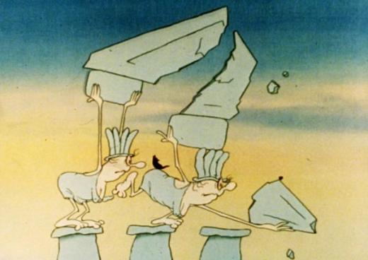Still from ‘Een Griekse tragedie’ featuring two caryatids trying to save their ruin