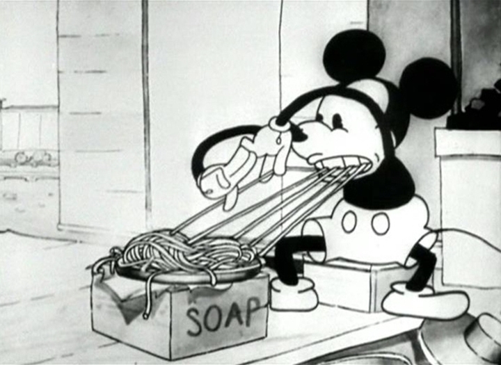 Still from ‘Mickey’s Choo-Choo’ featuring Mickey Mouse playing harp on his spaghetti