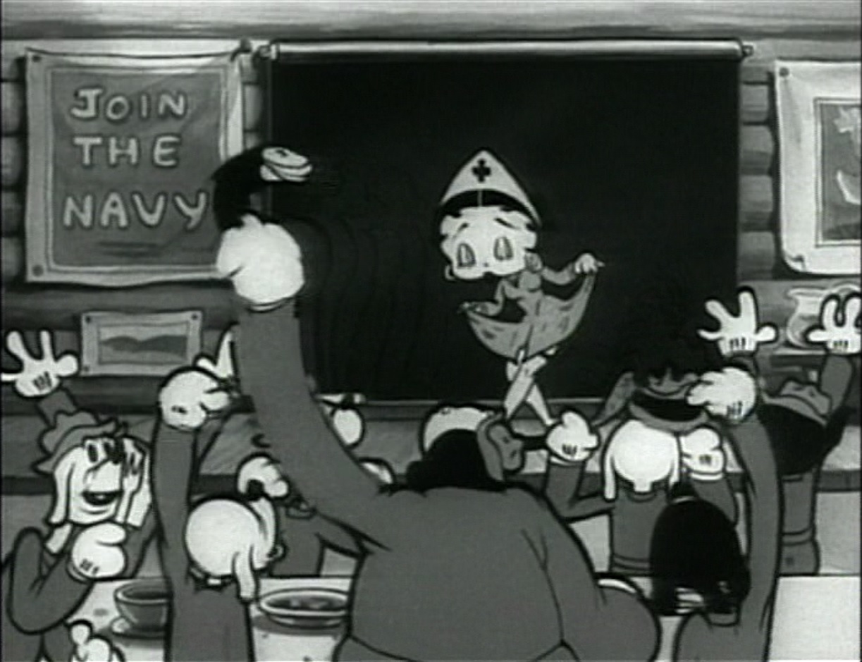 Still from ‘Oh! How I hate to Get up in the Morning’ featuring Betty Boop making a curtsey to a cheering crowd of soldiers