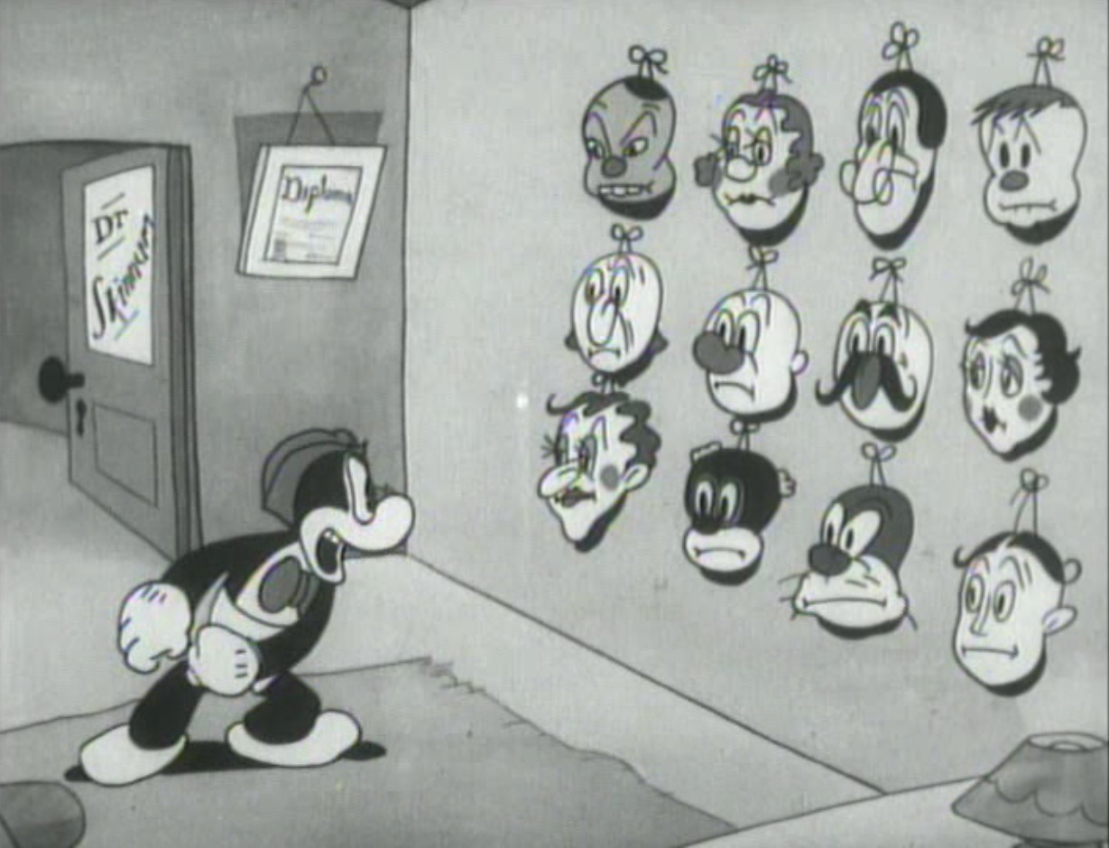 Still from ‘Funny Face’ featuring Flip the Frog singing with twelve masks