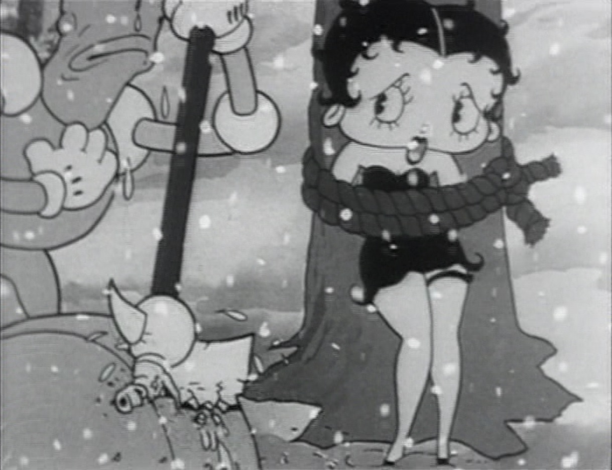Still from ‘Snow-White’ featuring Betty Boop tied to a tree, while Koko (in armor) sharpens an axe