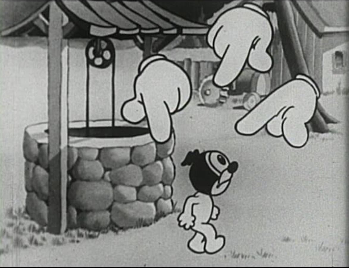 Still from ‘Panicky Pup’ featuring floating hands pointing at the pup accusingly