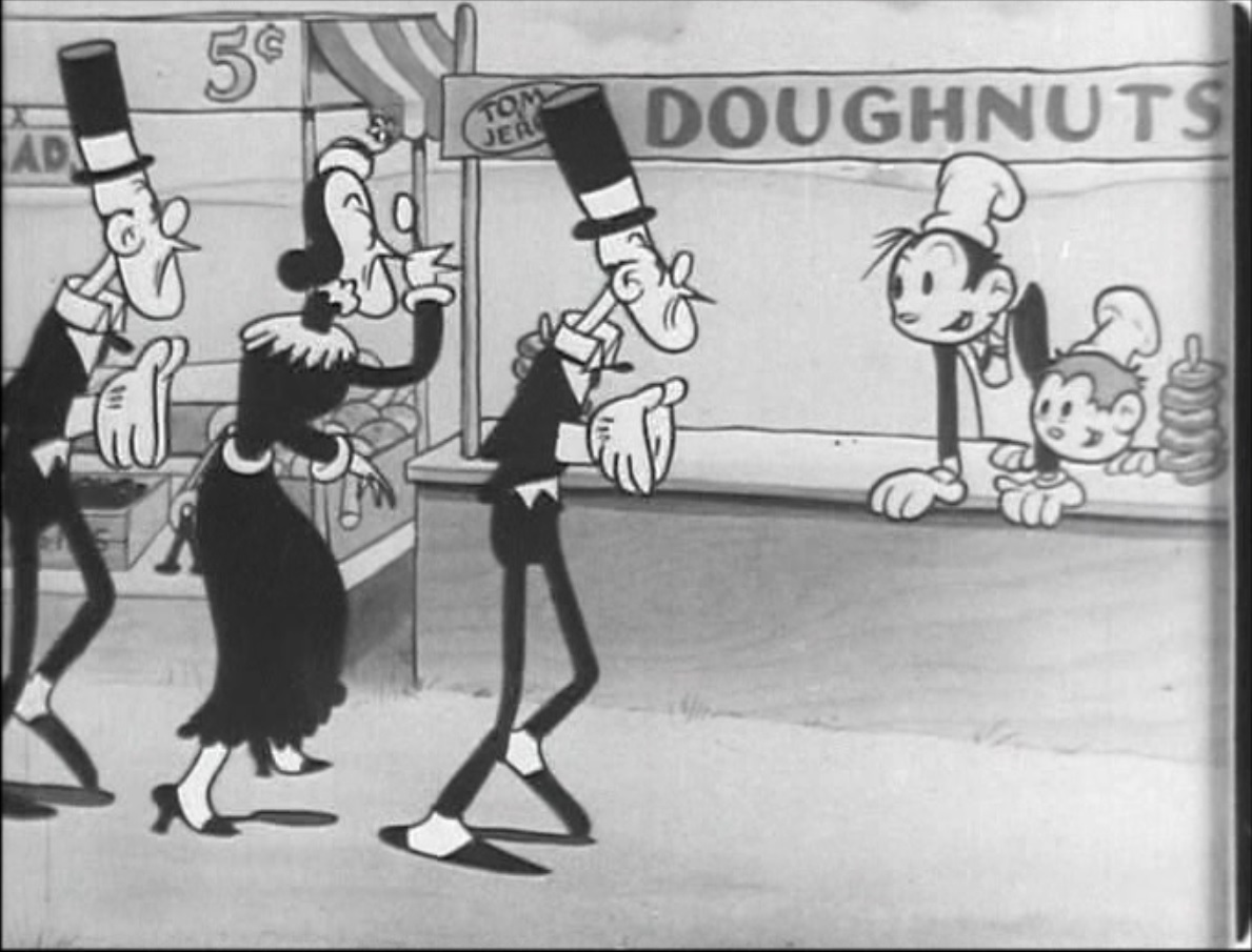 Still from ‘Doughnuts’ featuring a jury visiting Tom & Jerry’s doughnut stand