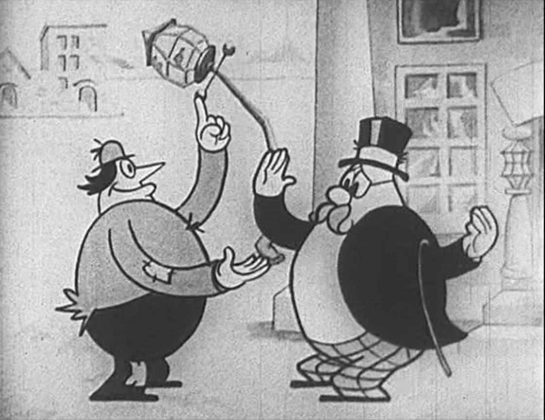 Still from ‘Marching Along’ featuring a beggar and a rich man