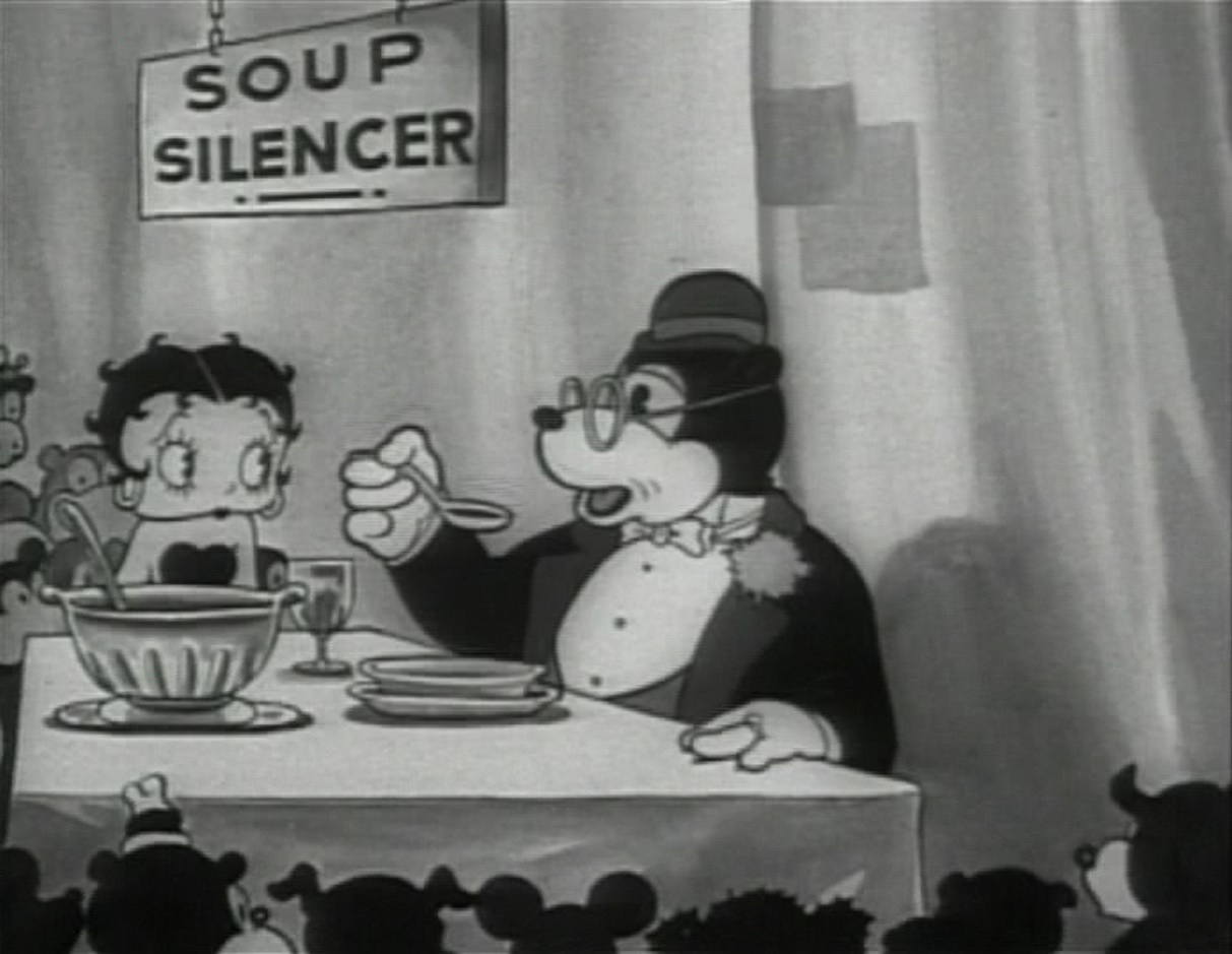 Still from ‘Betty Boop’s Crazy Inventions’ featuring Betty Boop and a customer trying the soup silencer