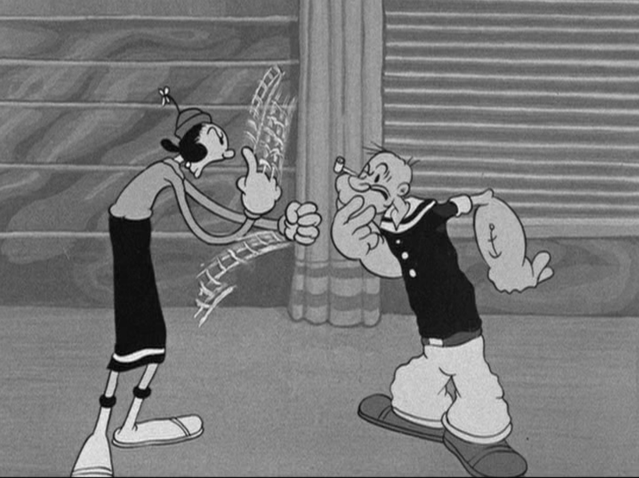Still from ‘Learn Polikeness’ featuring Olive Oyl being angry at Popeye