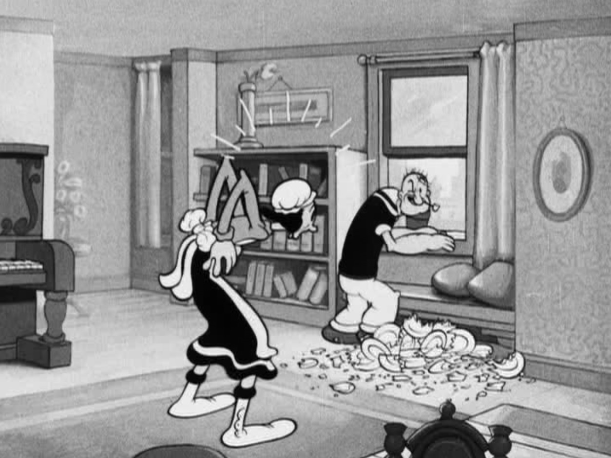 Still from ‘Cops Is Always Right’ featuring Olive Oyl discovering that Popeye has broken all her dishes