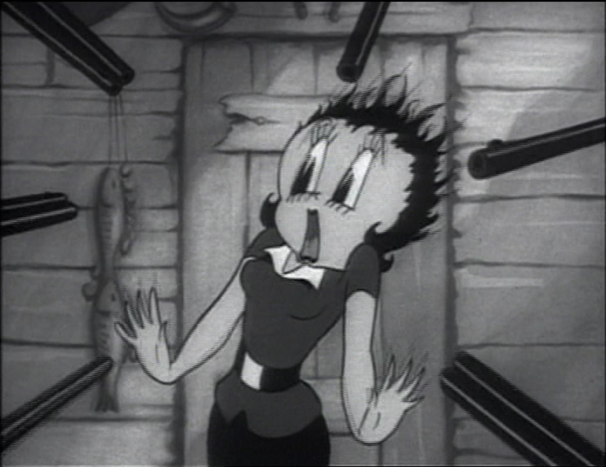 Still from ‘Musical Mountaineers’ featuring several gun pointing at Betty Boop