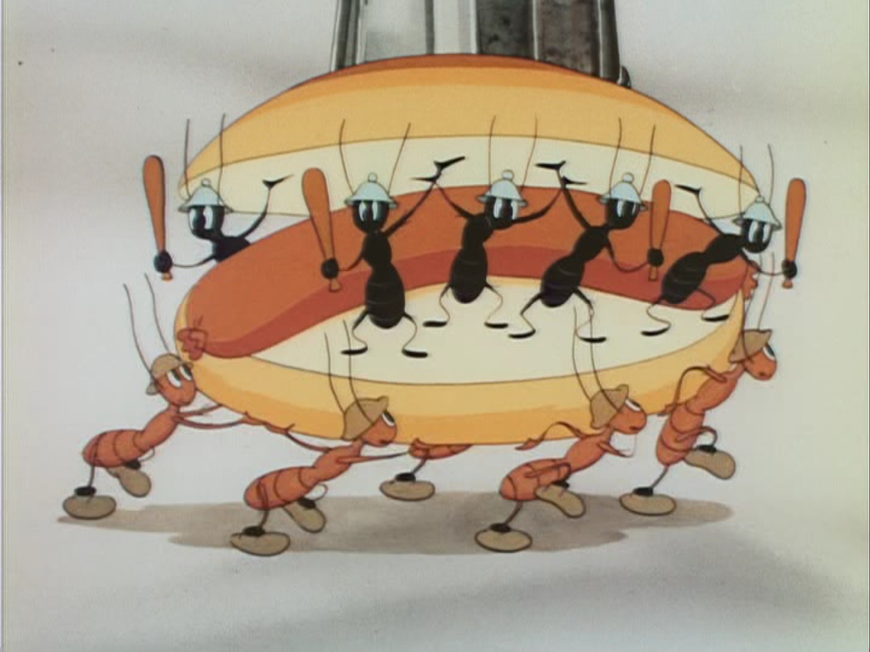 Still from ‘The Fighting 69 1/2th’ featuring black ants inside a hot dog, carried by red ants