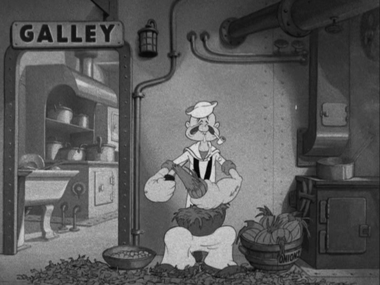 Still from ‘The Mighty Navy’ featuring Popeye peeling onions
