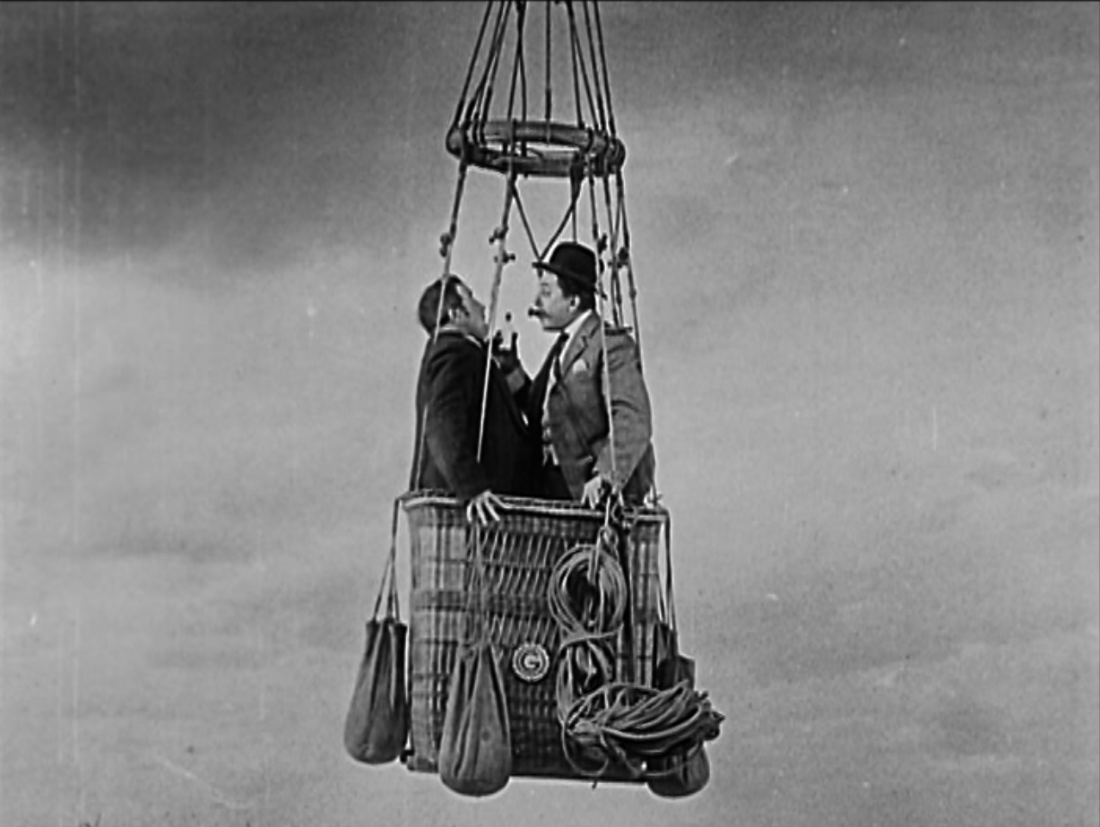 Still from ‘Le placier est tenace’ featuring the salesman confronting the fleeing man in a balloon