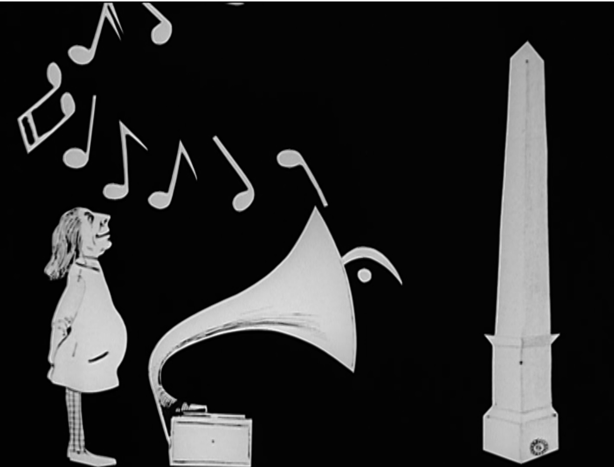 Still from ‘Rien n’est impossible à l’homme’ featuring a man playing a record player for an obelisk