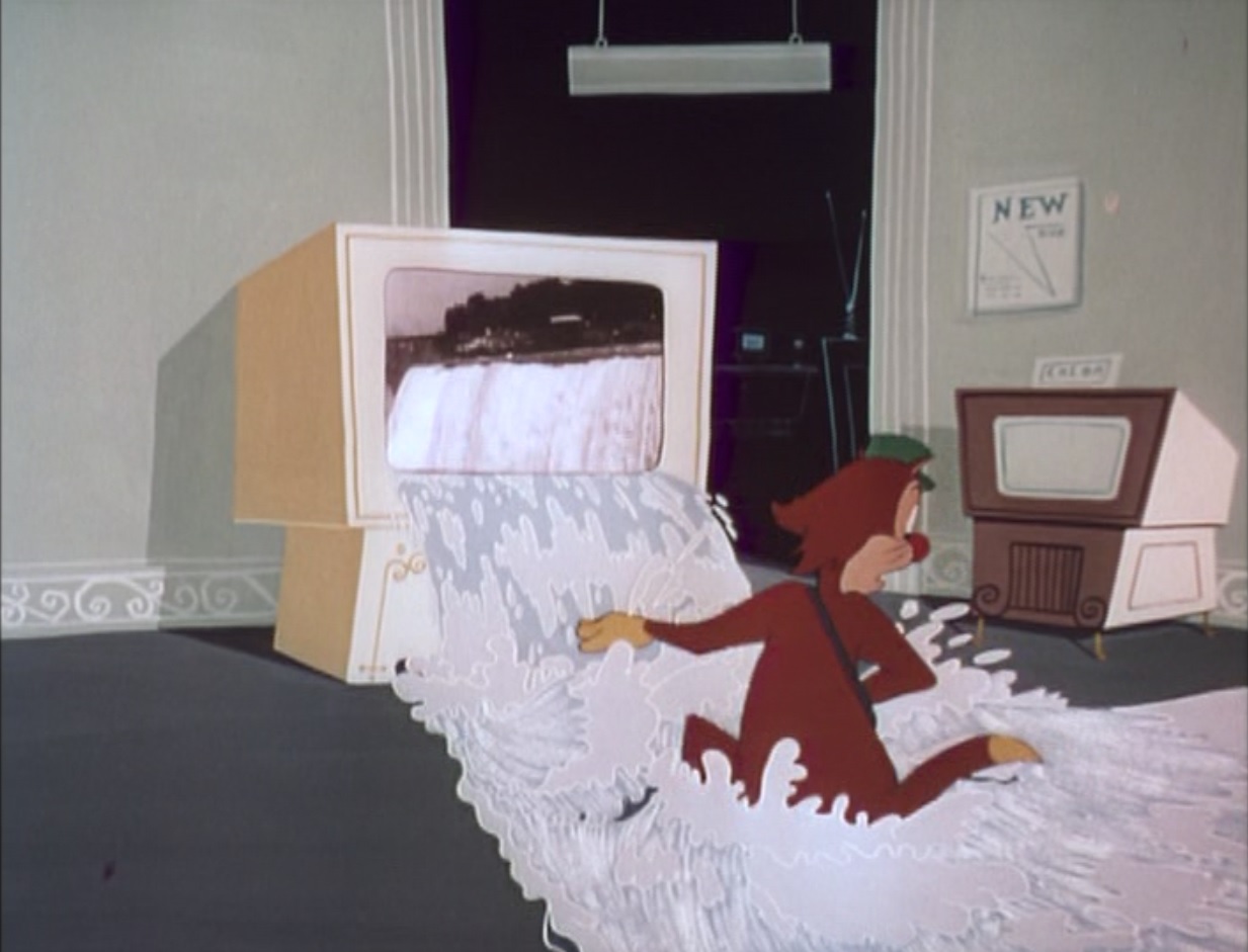 Still from ‘From Mad to Worse’ featuring Katnip flooded by a waterfall coming out of a television set