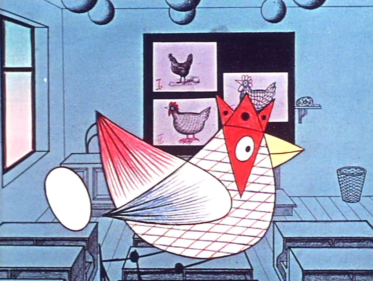 Still from ‘Spatne namalovana slepice’ (Gallina vogelbirdae) in which the semi-abstract hen takes flight