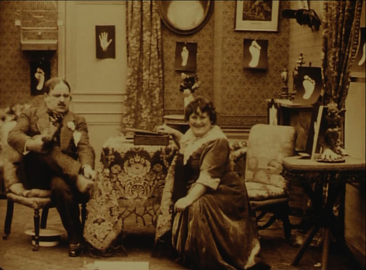 Still from ‘L’avenir dévoilé par les lignes de pied’ featuring the viscount removing his shoe to let the fortune teller make a print of his foot