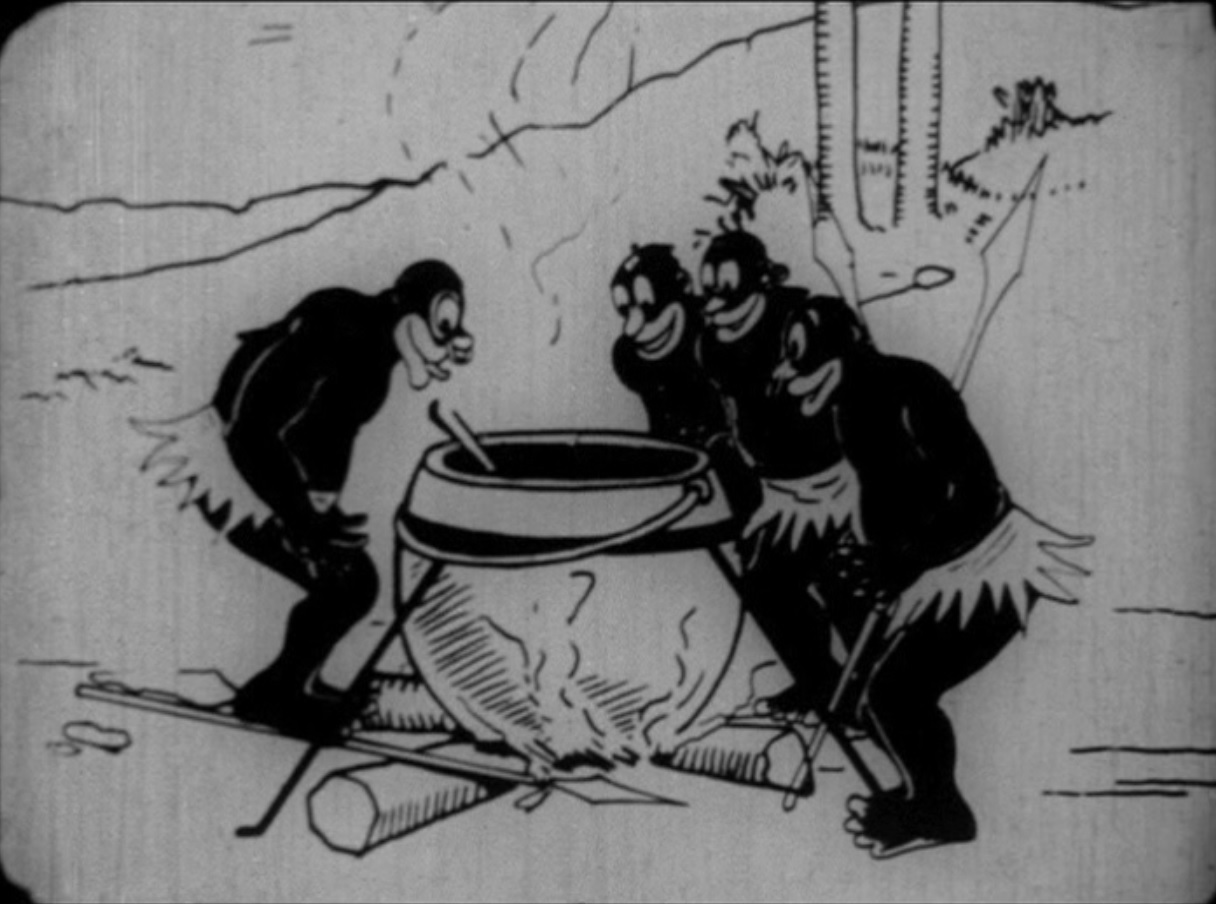 Still from ‘Professor Bonehead Is Shipwrecked’ featuring four cannibals around a cooking pot