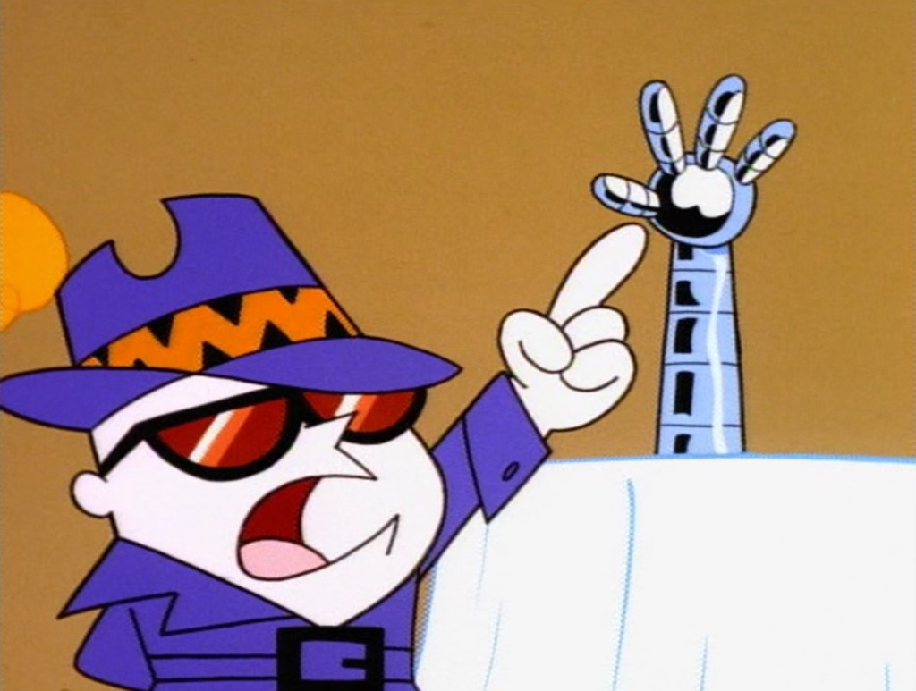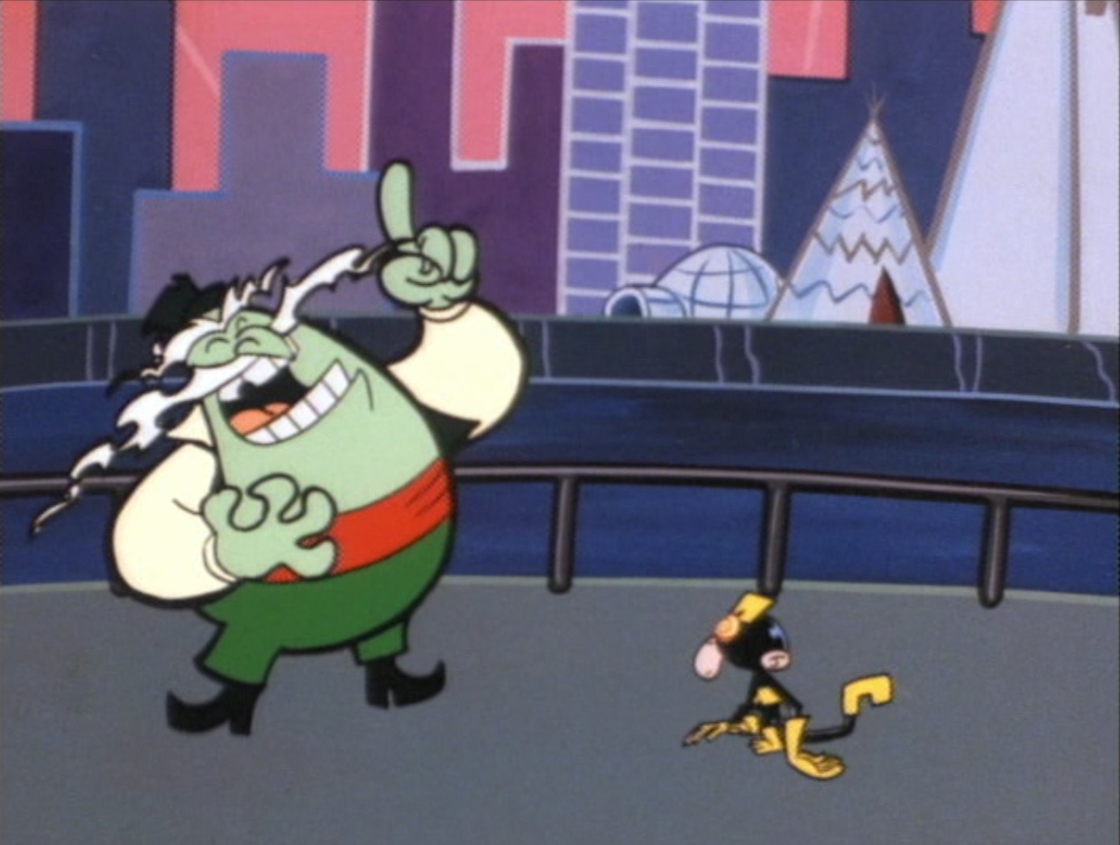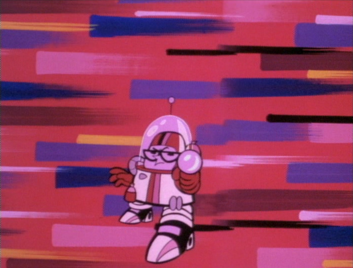 This alone accounts for a tiresome watch, but this episode also demonstrates that the ‘Dial M for Monkey’ doesn’t share the same eye for design as the surrounding ‘Dexter’s Laboratory’ sequences. The character designs are more generic, more like the dull 1970s Hanna-Barbera designs than Dexter’s 1950s UPA world, and the color schemes are uninventive and ugly. In fact, ‘Huntor’ emulates the cheap, ugly and forgettable cartoon style of 1970s Hanna-Barbera Saturday morning cartoons too much for comfort. The 1970s were a low point for studio animation, and I don’t want to be reminded of that, thank you.