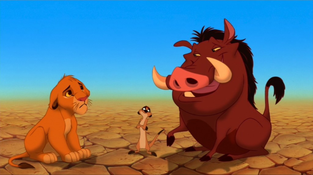 Being a nineties Disney film, ‘The Lion King’ of course is a musical, a genre that certainly is not my favorite, but I must admit that Elton John’s and Tim Rice’s songs hold up very well, greatly aided by the imagery. ‘The Circle of Life’, as said, makes an impressive opener; ‘I Just Can’t Wait to Be King’ is spiced by very bold colors, and stylized background art (as well as anteaters, which do not occur in Africa – a strange and unnecessary error); Scar’s song ‘Be prepared’ is accompanied by evil greens and purples in a clear echo of Maleficent in ‘Sleeping Beauty’ (1959), and the love ballad ‘Can You Feel the Love Tonight’ is rescued from sappiness by the inclusion of Timon and Pumbaa mourning the loss of their friend. All these songs propel the story forward, none more so than the best song of all, ‘Hakuna Matata’, which neatly changes the infant Simba into the adult one.