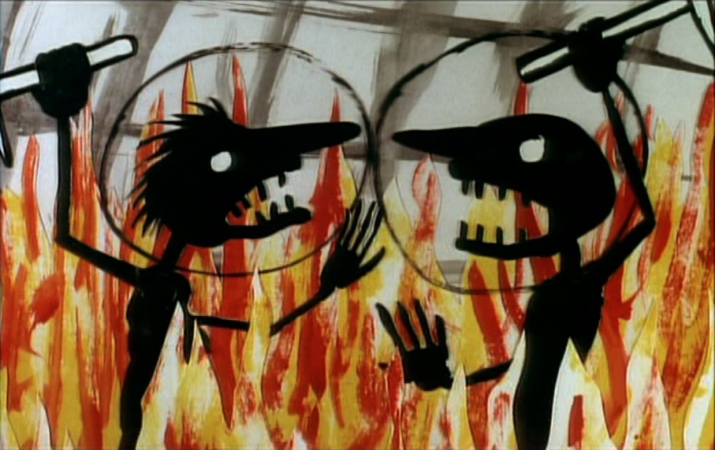 The Best scene of the whole film, however, features little animation. This is when the man summons Mephistopheles. This scene is full of compelling images, with brooms dusting as if they were alive, drums playing themselves, crossbows appearing from pillars, and a burning wagon circling the summoner. During this scene the scenery changes from indoor to outdoor repeatedly, with the man finding himself in the woods, on top of a mountain and on a snowy plain.