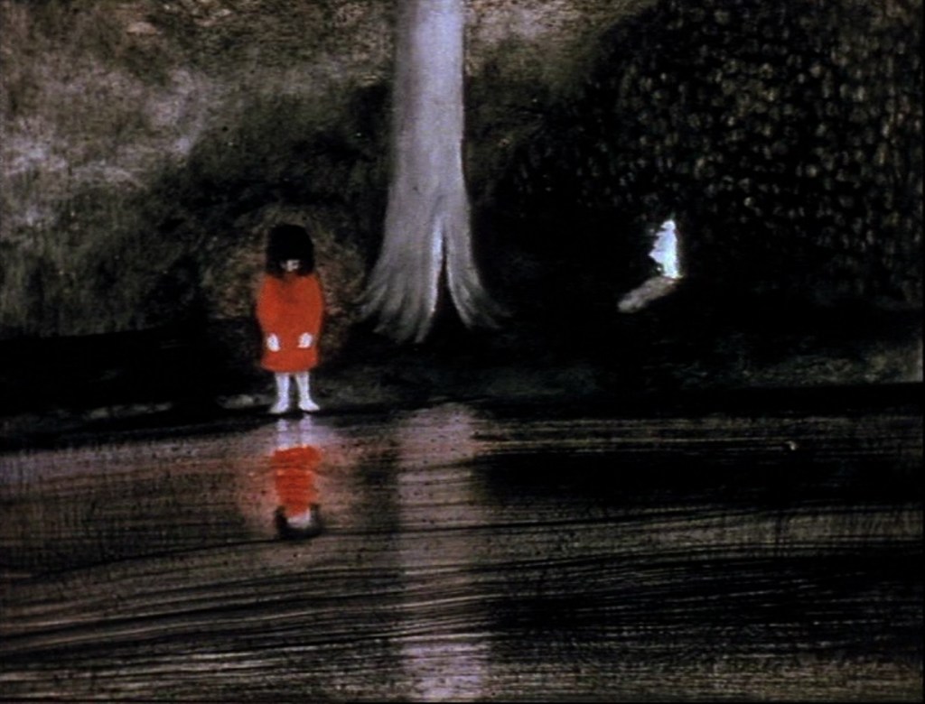 The film turns particularly puzzling when the little girl drops two bunny-like creatures from under her skirt, which dance with a blue spirit, living inside a hollow tree, while the girl seems to change into some electrical firework(?) What this all might mean, remains an utter mystery to me.