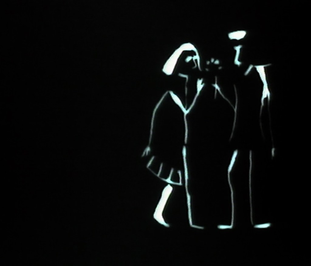 ‘The Wooden Leg’ is an animation film made directly on film (apparently using a wooden twig) with a wooden twig and ink on white paper, with the images reversed later from black on white to white on black (many thanks to Darren Doherty for clarifying the method below!). Thus it features very simple, but surprisingly effective designs, all consisting of white lines on a black canvas. Yet, Doherty & Smith manage to put a lot of emotion in their simply drawn characters. Despite the rather dark subject matter, the film retains a lighthearted feel and stays with the girl and her special bond with the leg. The animation is accompanied by an effective piano score by Mike Taylor.