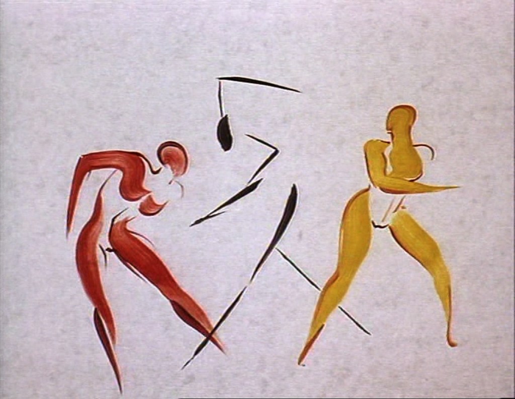 The fluency of the movement combined with the elegance of Russell’s paintwork make the film a delight to watch. During most of the film the three dancers remain recognizable as human forms, but at times they change into almost abstract forms, with a strong Bauhaus influence.