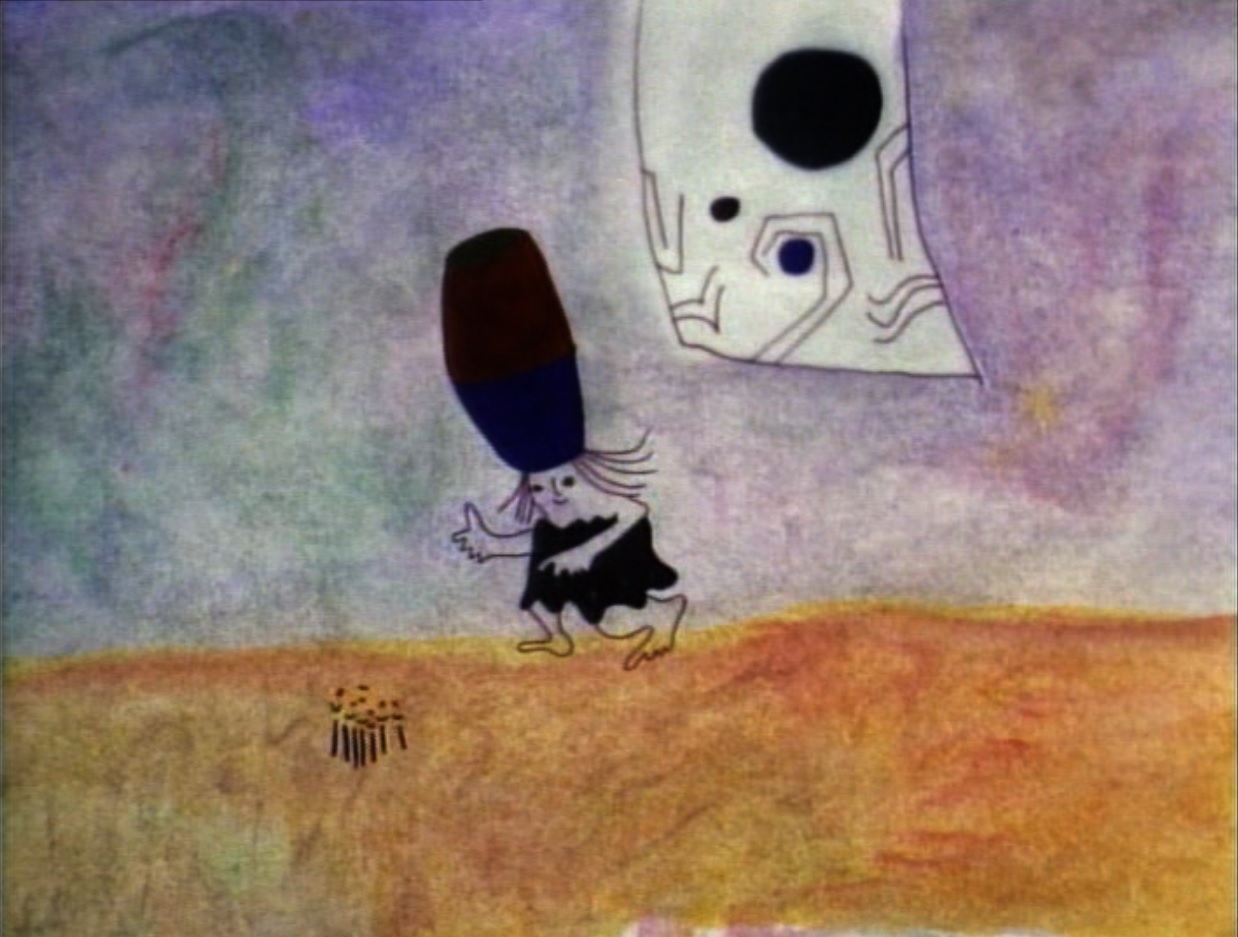 The film consists of five very short chapters, and uses citations from Chief Seattle, Lao Tse and Kabir. Throughout the film Hubley’s Joan Miró-like imagery remains beautiful, poetic and intriguing, but as most images consist of short animation cycles of semi-abstract figures dancing with joy, any story is hard to follow.