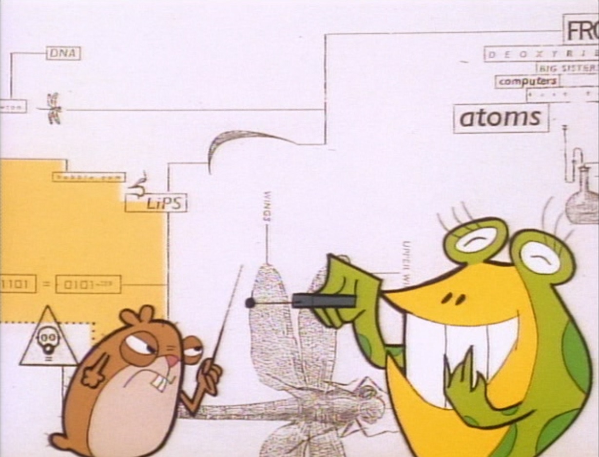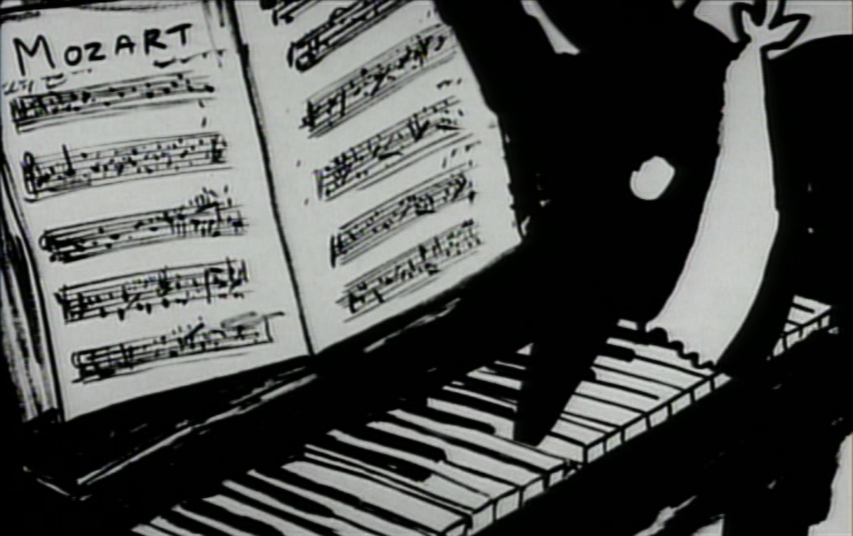 Faith Hubley recalls her own first period, and the unhealthy attitude her own mother had towards this natural phenomenon. Emily Hubley illustrates this remarkably frank and autobiographical tale with images that are related to but different from her own mother’s art. The younger Hubley relies much less on animation cycles than her mother, and pimps her images with collage art, photographs and the use of bits of cut-out animation. Her style is less poetic than her mother’s, but her images support her mother’s narrative very well.