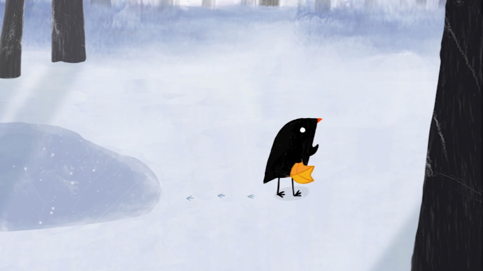 When the leaf falls off, the little bird tries to retrieve it, while being chased by a hungry fox. The film uses no dialogue, but simple, attractive designs, and excellent timing. Animated in 2D in the computer, the film makes great use of its winter setting.