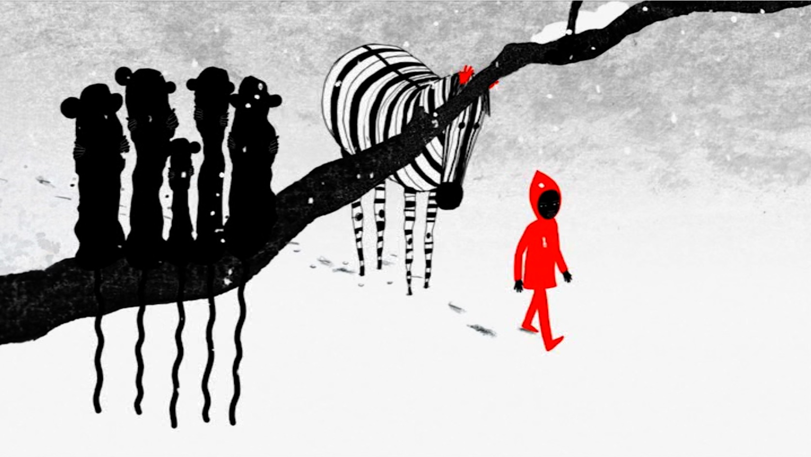 This is a charming little film done in a quasi-naive style, and making good use of black and whites, with occasional flashes of color. Especially the scenes in which the boy explores the snow-covered world are beautiful, with his red coat, shawl, hood and mittens standing out against the blacks, whites and greys of the animals and their surroundings. Also noteworthy is Chernysheva’s excellent timing, and the sound design, which is spot on.