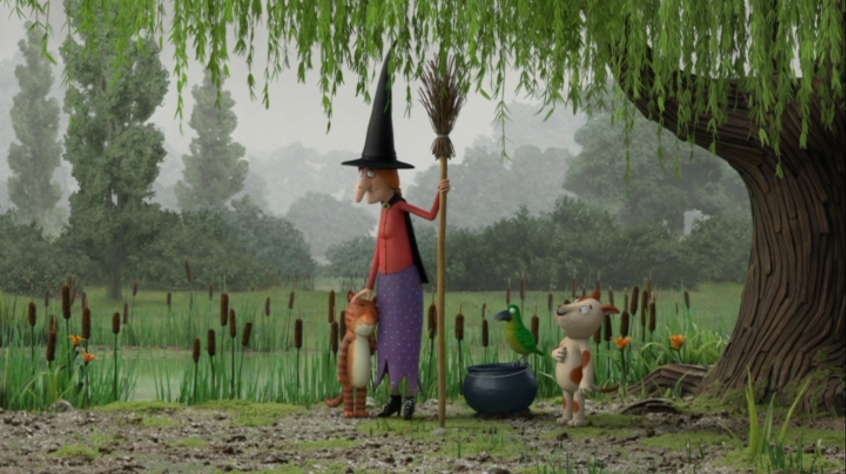 ‘Room on the Broom’, the third entry in the series, is an excellent example. The story tells about a friendly witch who flies on a broom with her cat, but at times she drops something on the ground. This is then found by an animal who asks for a place on the broom. The repetition and rhyme no doubt work excellently for small children, but elder viewers will delight in the cat’s wordless reactions to his mistress’s enthusiastic invitations. His body language and facial expressions form the pinnacle of pantomime animation, but there are touches of wordless comedy on all the characters. In the end a ‘Town Musicians of Bremen’-like story twist is introduced.