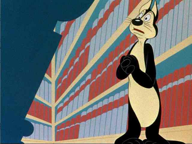 The cartoon starts gloomily enough, with a misty harbor scene, where a mouse is trying to commit suicide. He’s rescued by Hippety Hopper, however, and together they face the mouse’s terror: Sylvester the cat. The mouse makes Sylvester think he can grow tall, and lets Hippety Hopper beat him out of the house. The best comedy comes from a bulldog who keeps pushing Sylvester back inside.