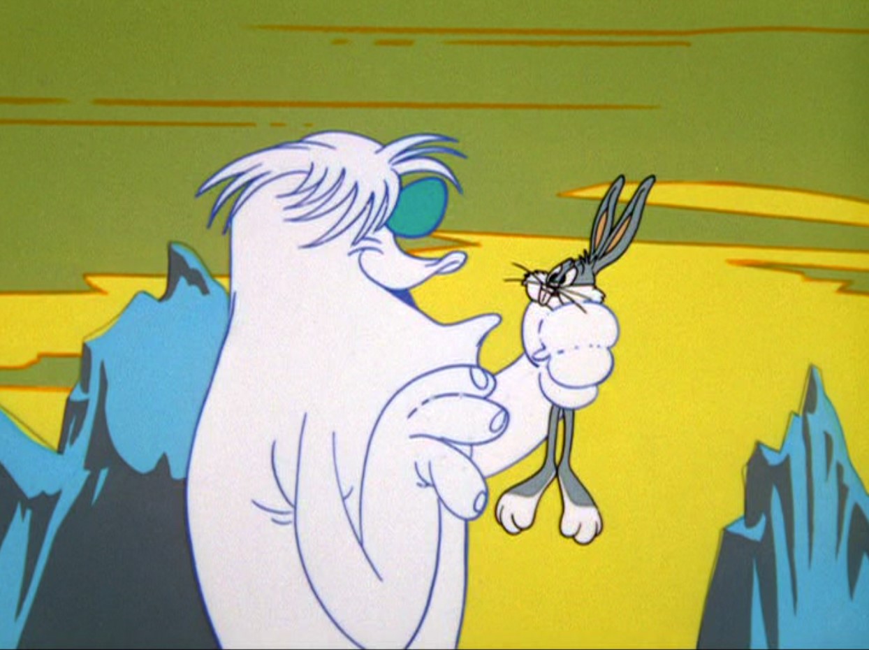 In this cartoon Bugs and Daffy both travel underground, apparently on their way to Palm Springs, only to end up in the Himalayas, where they encounter a very cartoony and blue-nosed abominable Snowman. The Snowman is a late addition to a plethora of characters based on Lon Cheney’s depiction of Lenny in ‘Of Mice and Men’ from 1939, without adding anything. Apart from the jaded gags, the cartoon suffers from a large amount of dialogue, rendering the cartoon almost like the “illustrated radio” Chuck Jones detested in contemporary television animation.