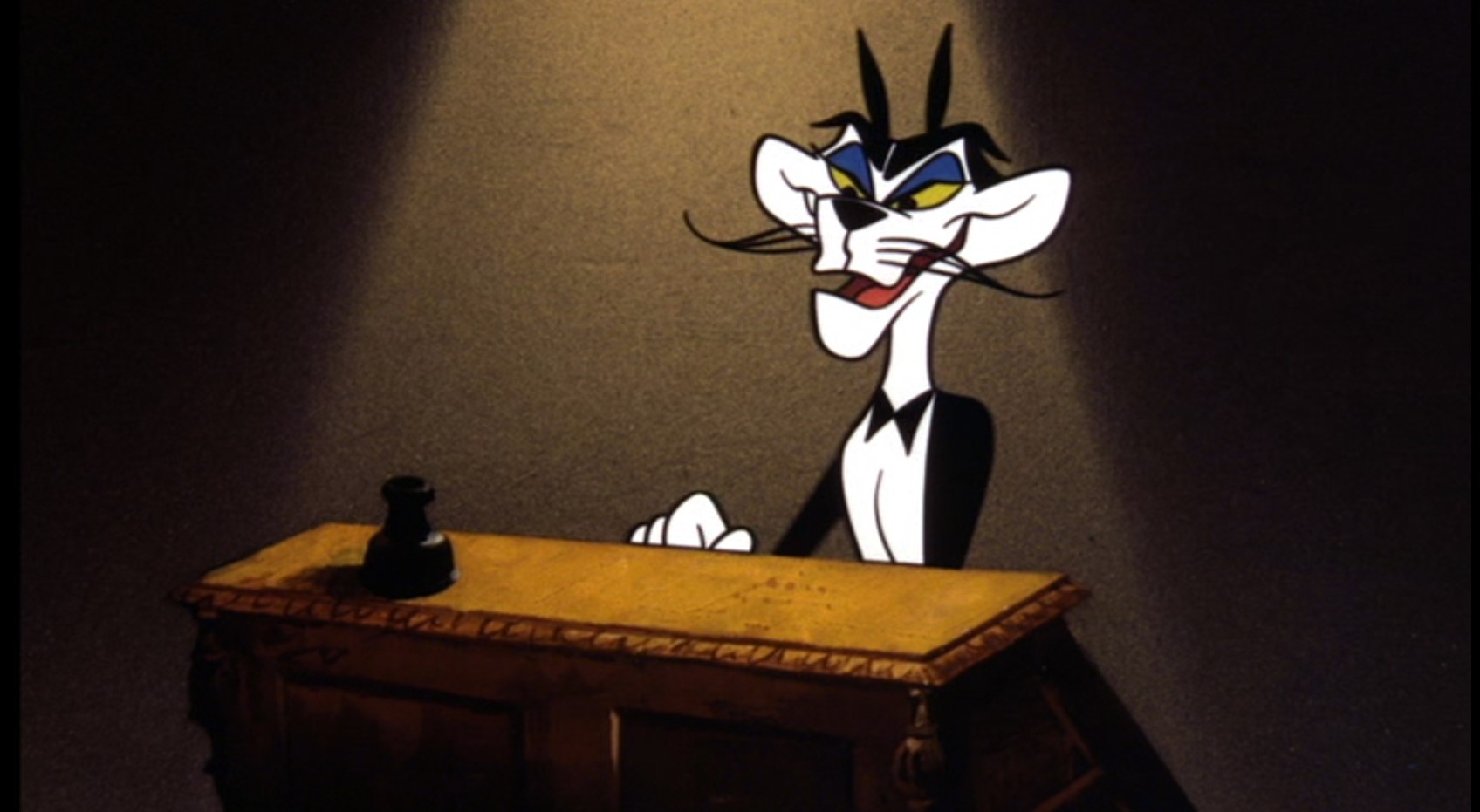 Bugs Bunny is the sole performer in the cartoon – we don’t even see the orchestra members, only their instruments. Bugs Bunny and the orchestra play Franz von Suppés overture ‘Morning, Noon and Night in Vienna’ (1844), which Bugs conducts not only with his hands, but also with his ears and feet. Like earlier conductors Mickey (‘The Band Concert‘, 1935) and Tom (‘Tom & Jerry at the Hollywood Bowl‘, 1950) Bugs has some troubles while conducting: with a fly, echoing Mickey’s problems with a bee in ‘The Band Concert’, and with his collar and cuffs, echoing Mickey’s problems with his over-sized costume. Highlight is Bugs’ reenactment of a Western pursuit featuring a cowboy, an Indian and the cavalry, only using his ears to change into each character.