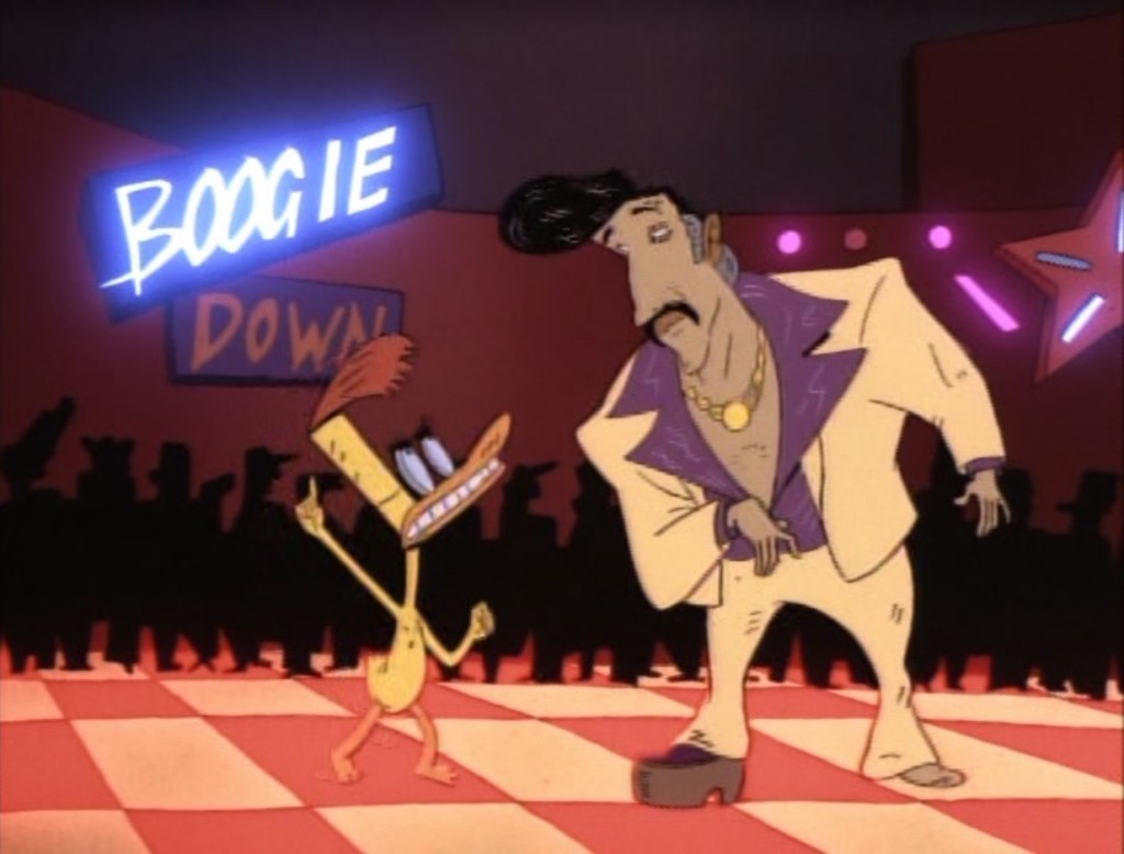 The episode indeed suffers from heavy-handedness, and Duckman in particular, seems quite at loss here. The best part is when Duckman and Cornfed drive into the 1950s suburbia, which changes them from full color into black and white, prompting Cornfed to say “it appears they don’t allow people of color in this community“. Also remarkable, but much less functional is the beauty pageant-turning-into-a-big fight with which the episode opens.