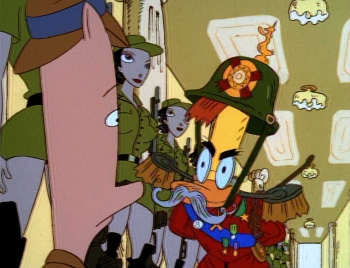 This turns out to be quite a hell-hole (there’s even a reference to the Exxon Valdez oil spill from 1989), and Duckman’s rant about it starts no small revolution, turning him into the country’s dictator. As Duckman himself says, when he gets unlimited power, what can possibly go wrong?