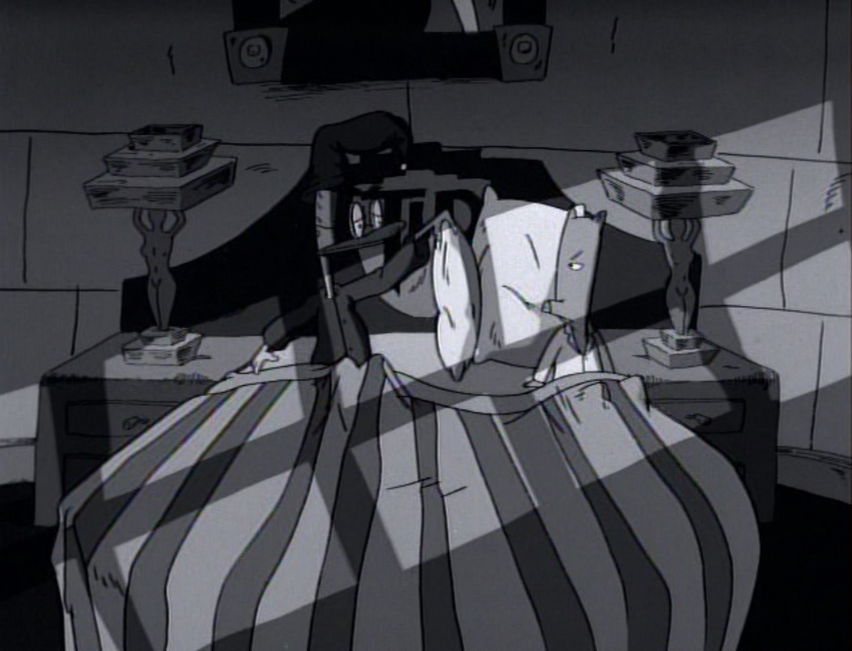 ‘Color of Naught’ is noteworthy for the outlandish animation on the Beautex Salesman, and for King Chicken’s rather original way of destroying Duckman’s world, reducing characters and background art to black and white sketches, before turning into nothingness.