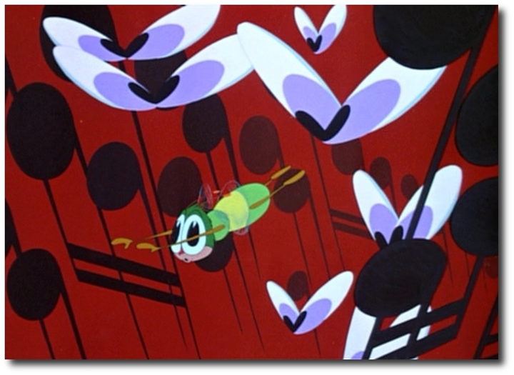 ‘Bumble Boogie’ is far more colorful, however, with bright colors sometimes changing within semi-seconds. At one point, the little bumblebee is even rendered only in lines, anticipating the graphic style of the fifties, and of UPA in particular.