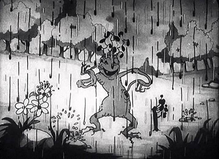 In this particular short we watch flowers dancing to Edvard Grieg’s ‘Morning’ from ‘Peer Gynt’. The flowers are very similar to the ones in ‘Flowers and Trees‘ from 1932. There are also several dancing animals: bugs, a caterpillar, crows, grasshoppers, frogs, a spider and a heron. The latter three dance to Amilcare Ponchielli’s ‘Dance of the hours’, which would be reused in the much more famous ‘Fantasia’ (1940). Besides the dancing there’s a remarkable portion of devouring: the crow eats the caterpillar, the heron eats the four frogs. The most extraordinary scene is the short rain storm scene, in which we watch a tree bathing in the rain.