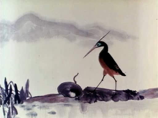 In ”The Snipe and the Clam’ Hu Jinqing excels in gorgeous watercolor backgrounds, beautiful designs, great silent acting and remarkably naturalistic cut out-animation of the animals. In comparison, the animation of the fisherman is simple and rather crude. The film unfolds at an unhurried, almost meditative speed, which can make it difficult to enjoy.