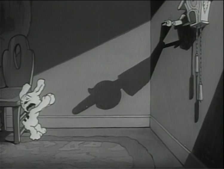 When you read this, the cartoon seems to make some sense, but the real thing is rather different: there’s a lot happening on the screen, and nonsensical gags fill every scene. For example, during the chase scene, various skeletons appear at random, giving the cartoon its typical horror atmosphere, but adding nothing otherwise. This gives the cartoon a rather stream-of-consciousness-like character, and at every point one expects Oswald to wake up from this random nightmare.