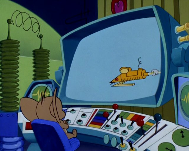 In their third science fiction short Jerry’s stealing cheese from a ‘cheese mine’ protected by police officer Tom. Both use the robots from ‘Guided Mouse-ille’ to fight each other. The film uses a whole scene twice and reuses a complete scene from ‘Guided Mouse-ille’, adding to a very cheap feel.