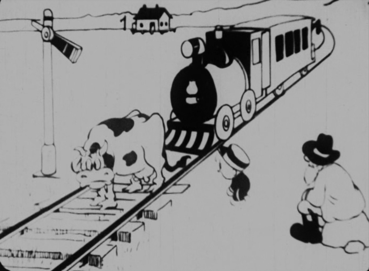 In this short he’s a train engineer, who’s scolded by his boss of killing too many animals on the train track. And indeed, only a few seconds after leaving the train station Jerry encounters a cow, which after some action is killed.