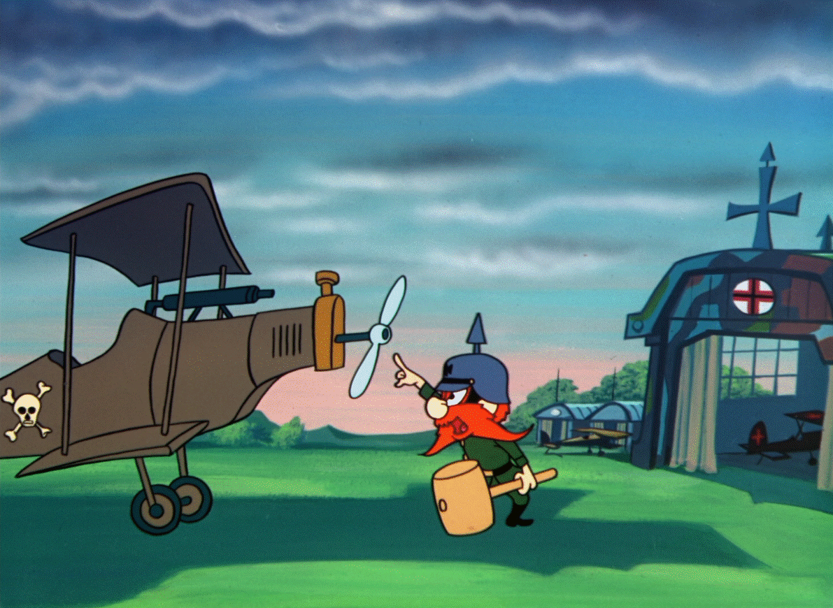 ‘Dumb Patrol’ is the last of the Bugs Bunny vs. Yosemite Sam cartoons, being the last screen appearance by the hot-tempered little villain, after a career of nineteen years. Set in World War I the film is dedicated to an air battle between Bugs and Sam, here billed as Sam von Shpamm.
