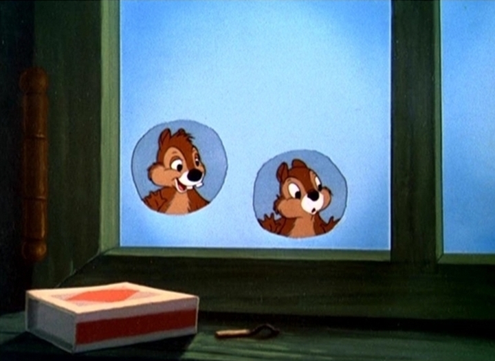 In this cartoon they are named for the first time, and it’s also the first cartoon in which they are two distinct characters, although Dale still lacks his characteristic red nose here. Here they’re teamed against Donald Duck for the first time, their former adversary being Pluto. The short marks the beginning of a series of twenty cartoons, only ending in 1956, at the very end of the era of Disney shorts.